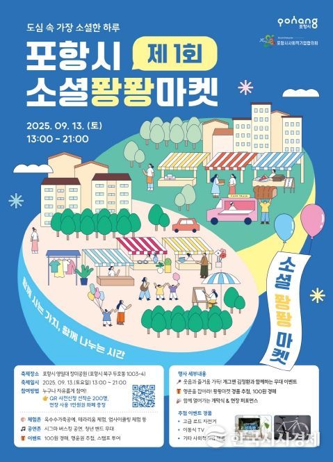 한국시사경제 한장선 객원기자 | 포항시사회적기업협의회(회장 신배성)는 오는 13일 영일대 장미원 광장 일원에서 사회적경제기업 임직원과 시민이 함께하는 제1회 소셜퐝퐝마켓을 개최한다고 밝혔다.