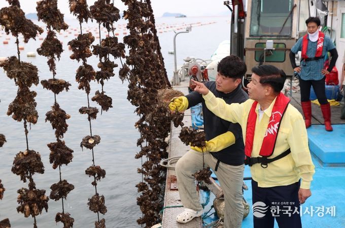이상근 고성군수, 산소부족 물덩어리 발생에 따른 굴·가리비 피해 양식장 현장 방문
