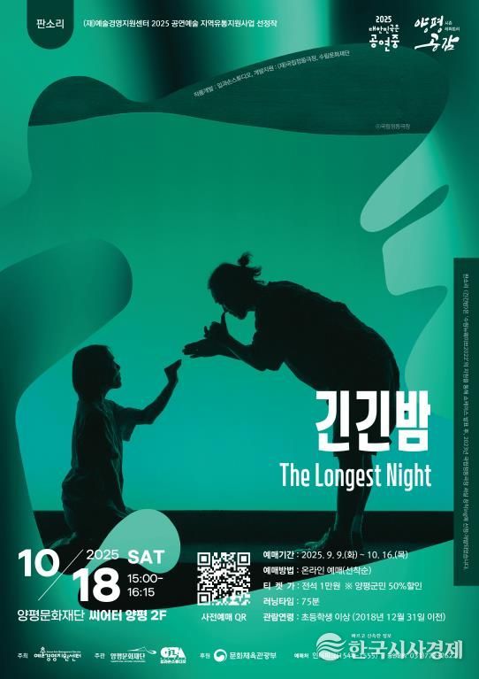 한국시사경제 윤광희 기자 | 양평문화재단은 오는 10월 18일 오후 3시, 양평문화재단 2층 씨어터양평에서 2025년 시즌레퍼토리 ‘양평공감’의 여덟 번째 작품인 입과손스튜디오의 판소리 ‘긴긴밤’을 선보인다.