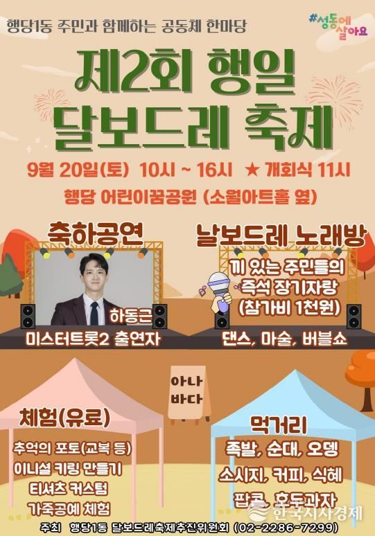 한국시사경제 윤광희 기자 | 서울 성동구 행당제1동은 오는 20일 행당 어린이꿈공원에서 ‘제2회 행일 달보드레 축제’를 개최한다고 밝혔다.