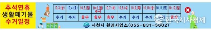 한국시사경제 윤광희 기자 | 사천시는 추석 명절을 맞아 9월 8일부터 10월 12일까지 ‘2025년 추석 폐기물 관리대책’을 수립·추진해 명절 쓰레기 대란을 사전에 막는다고 10일 밝혔다.
