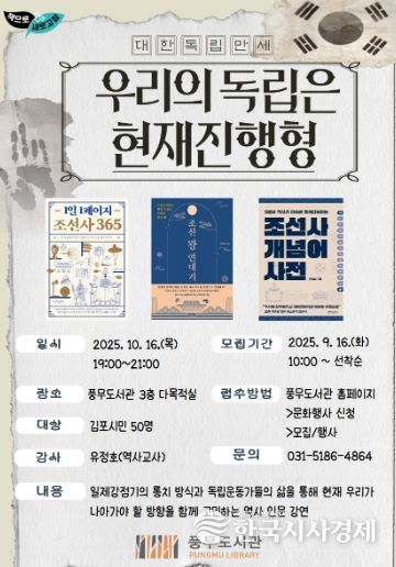 한국시사경제 윤광희 기자 | 김포시 풍무도서관에서 달밤인문학 프로그램인 ‘우리의 독립은 현재진행형’을 오는 10월 16일 오후 7시부터 9시까지 운영한다.