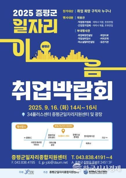 한국시사경제 충북취재본부 | 충북 증평군은 지역 일자리 창출 및 구인ㆍ구직자간 미스매칭 해소를 위해 오는 16일 34플러스센터 3층과 광장에서 ‘2025년 일자리 이음 취업박람회’를 연다.