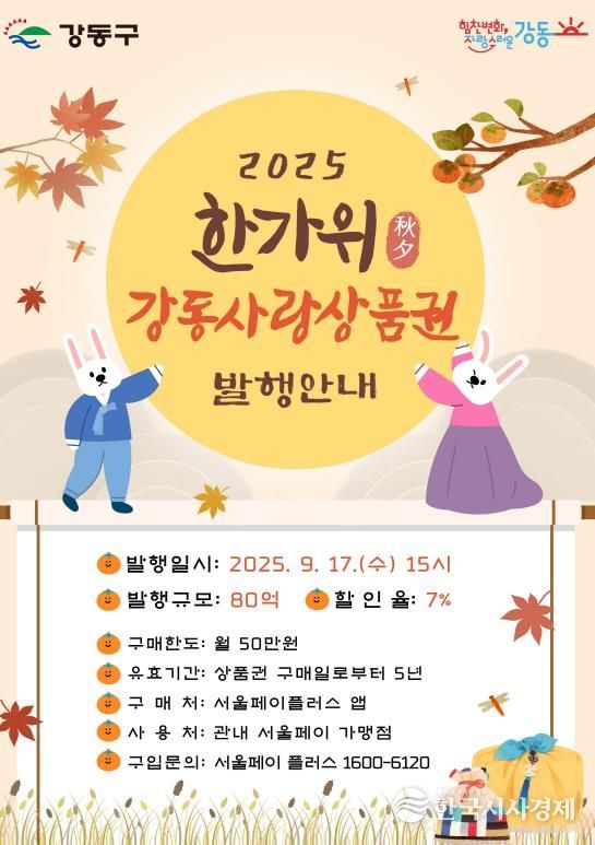 한국시사경제 한장선 객원기자 | 강동구는 추석 명절을 맞아 9월 17일 15시부터 총 80억 원 규모의 강동사랑상품권을 7% 할인 판매한다고 밝혔다.