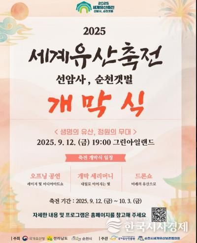 한국시사경제 전남취재본부 | 순천시와 순천시 세계유산보존협의회는 오는 12일 19시 그린아일랜드에서 '2025 세계유산축전 선암사, 순천갯벌' 개막식을 개최한다고 밝혔다.