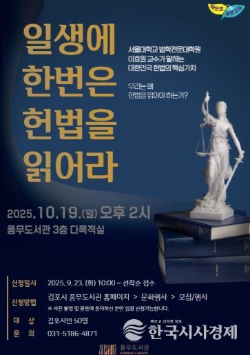 한국시사경제 윤광희 기자 | 김포시 풍무도서관에서는 시민 교양 인문강좌의 일환으로 ‘일생에 한번은 헌법을 읽어라’를 오는 10월 19일 오후 2시부터 4시까지 운영한다.