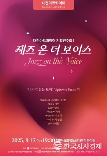 한국시사경제 대전취재본부 | 대전아트콰이어가 오는 9월 17일 대전시립연정국악원에서 창단 이후 첫 기획연주회인 ‘재즈 온 더 보이스(Jazz on the Voice)’를 선보인다. 이번 공연은 전통 합창 레퍼토리를 넘어 대중과 호흡할 수 있는 재즈 중심의 프로그램을 마련, 합창 음악의 새로운 가능성을 보여줄 무대로 기대를 모은다.