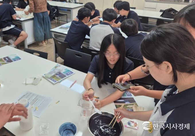 이 수업에서 학생들은 마을교육공동체 활동가이자 감물 염색 전문가인 박지혜 강사와 함께 전통 쪽염색을 체험하며 색이 변하는 과학 원리를 탐구하고 섬유의 성질과 화학 반응을 연결해 보는 경험을 쌓았다.