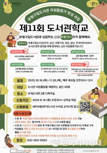 한국시사경제 사회팀 | 부평구 구립 부개도서관은 18일부터 2025년 부평구립도서관 자원활동가 양성 과정 ‘제11회 도서관학교’ 참가자를 모집한다.