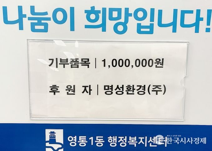 한국시사경제 사회팀 | 지난 17일, 명성환경(주)은 추석 명절을 맞이하여 어려운 이웃에게 전달해 달라며 성금 100만원을 경기사회복지공동모금회를 통해 영통1동에 기탁했다.