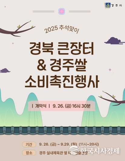 한국시사경제 경북취재본부 | 경주시는 오는 26일부터 29일까지 나흘간 황성공원 실내체육관 옆 타임캡슐광장에서 ‘2025 추석맞이 경북 큰장터 & 제3회 경주쌀 소비 촉진행사 특별전’을 개최한다고 21일 밝혔다.