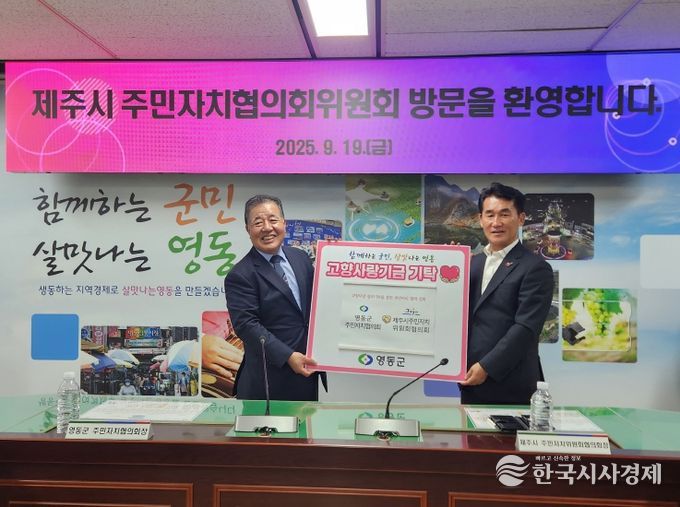 한국시사경제 충북취재본부 | 충북 영동군 주민자치협의회(회장 김재구)는 지난 19일, 2025 영동세계국악엑스포 개최를 축하하기 위해 영동군을 방문한 제주시 주민자치위원회협의회(회장 고정학)와 고향사랑기부금 상호 기부식을 진행했다고 밝혔다.