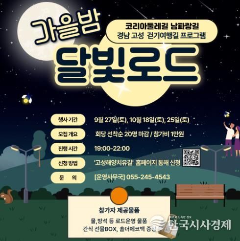 한국시사경제 윤광희 기자 | 고성군은 가을밤 시원한 바람이 불어오는 계절을 맞아 지역의 대표 야경 명소에서 특별한 치유 걷기 프로그램인 ‘달빛로드’를 운영한다고 밝혔다.