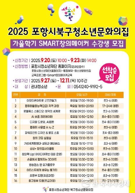 한국시사경제 문화팀 | 포항시청소년재단 북구청소년문화의집은 지역 청소년들의 창의력 향상과 진로 체험을 위해 ‘2025년 가을학기 Smart창의메이커’ 프로그램 수강생을 선착순 모집한다.
