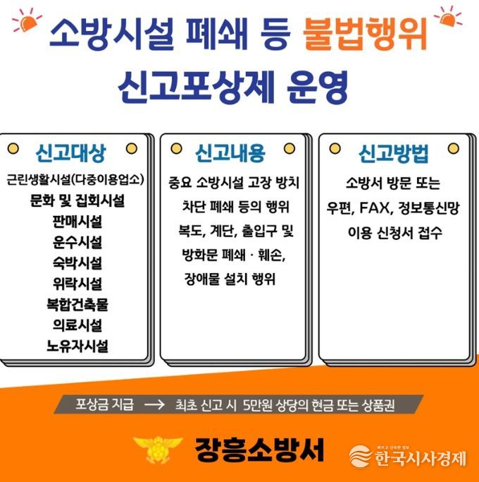 한국시사경제 오영주 기자 | 장흥소방서는 2025년 연중 운영되는 소방시설 불법행위 신고포상제를 통해 군민과 함께 안전한 지역사회 만들기에 나선다고 밝혔다.