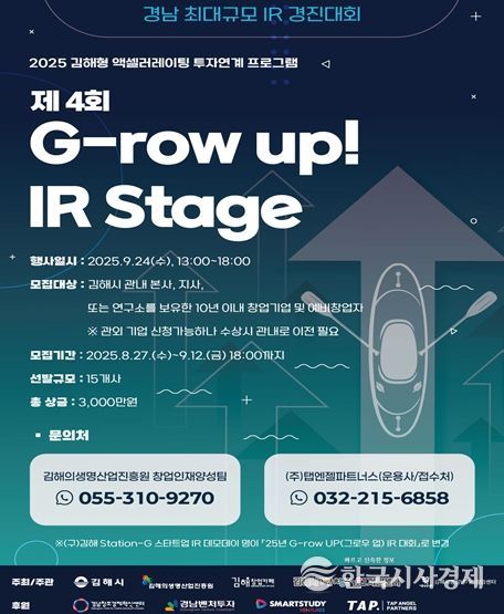한국시사경제 김태훈 기자 | 김해의생명·산업진흥원은 오는 9월 24일 김해롯데호텔앤리조트 수로홀에서‘제4회 G-row UP! IR Stage’를 개최한다고 밝혔다.