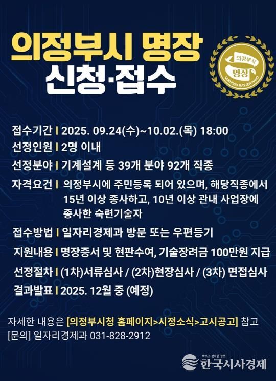 한국시사경제 경기북부취재본부 | 의정부시는 우수 숙련기술인을 발굴하고 숙련기술 우대 문화를 확산하기 위해 ‘2025년도 의정부시 명장’을 공모해 선정한다.
