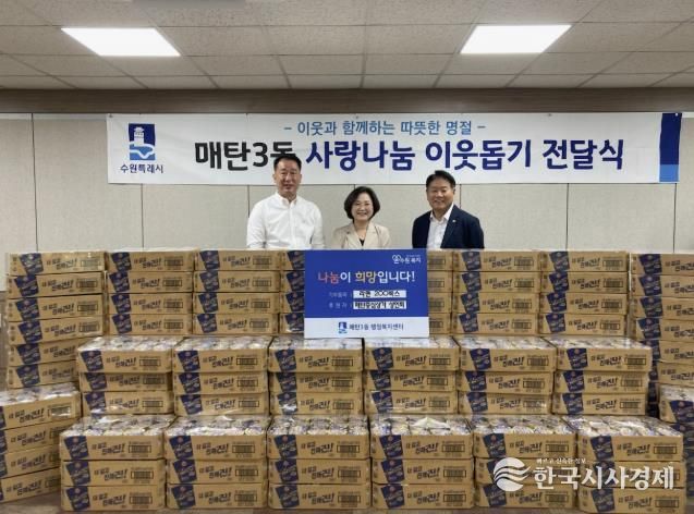 한국시사경제 사회팀 | 수원시 영통구 매탄3동행정복지센터는 지난 22일, 추석 명절을 맞이하여 매탄중심상가 상인회에서 후원한 컵라면 200박스 전달식을 가졌다.