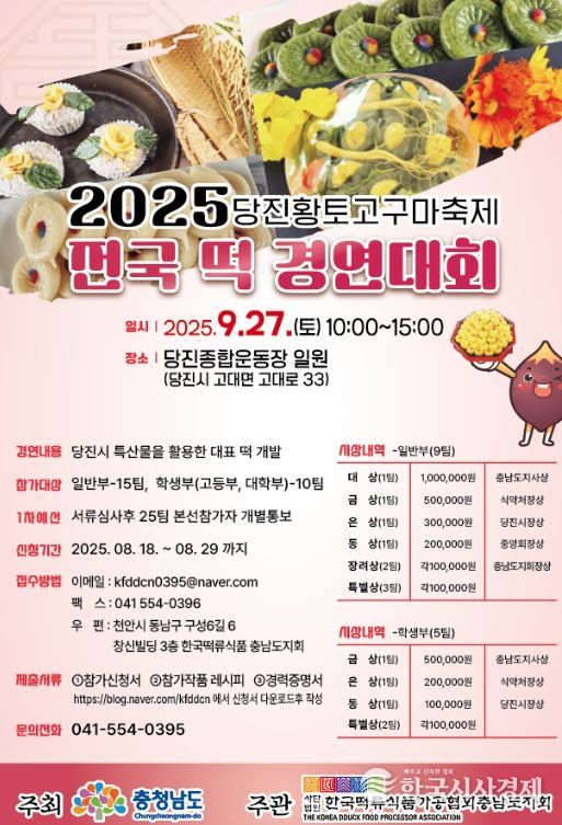 한국시사경제 충남취재본부 | 당진시는 오는 27일 오전 10시 50분부터 오후 3시까지 당진종합운동장 일원에서 ‘2025년 전국 떡 경연대회’를 개최한다고 24일 밝혔다.