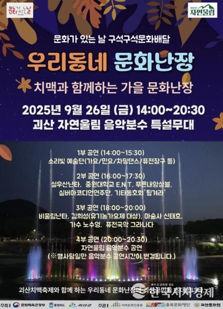 한국시사경제 충북취재본부 | 충북 괴산군은 ‘문화가 있는 날’ 주간을 맞아 오는 26일 오후 2시, 자연울림 음악분수 앞 특설무대에서 ‘문화가 있는 날 구석구석 문화배달 '우리동네 문화난장'’ 제7회차 행사를 개최한다고 밝혔다.