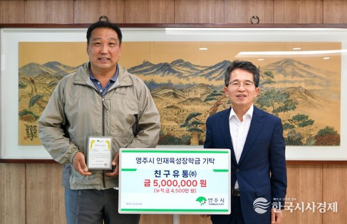 한국시사경제 경북취재본부 | 재)영주시인재육성장학회는 지난 23일, 친구유통㈜(대표 하원태)로부터 지역 인재 양성을 위한 장학금 500만 원을 기탁받았다고 밝혔다.