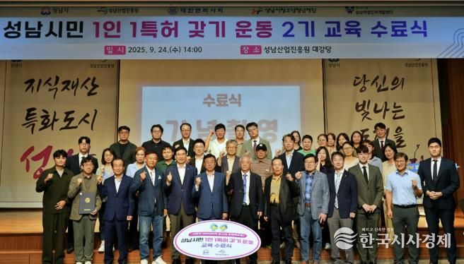 한국시사경제 경기취재본부 | 성남산업진흥원은 9월 24일(수) 대강당에서 『성남시민 1인 1특허 갖기 운동』 제2기 교육 수료식을 개최하고, 시민 지식재산 역량 강화의 성과를 공유했다.