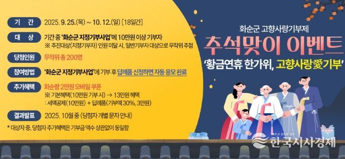 한국시사경제 권충현 기자 | 화순군은 민족 대명절 추석을 맞아 고향사랑기부제 감사 이벤트인 ‘황금연휴 한가위, 고향사랑愛기부’를 오는 9월 25일부터 10월 12일까지(18일간) 진행한다고 밝혔다.