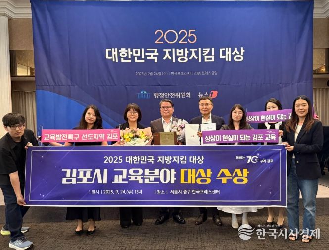 한국시사경제 경기북부취재본부 | 김포시가 9월 24일 서울 프레스센터에서 열린 '2025 대한민국 지방지킴 대상' 시상식에서 교육 부문 대상을 수상했다. 이번 행사는 뉴스1과 국회 행정안전위원회가 공동 주최했으며, 인구·돌봄·정주여건·교육 등 9개 분야에서 지방소멸 대응에 기여한 우수 지자체를 선정·시상했다.