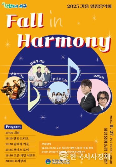 한국시사경제 광주취재본부 | 광주광역시 서구는 오는 27일 오후 7시 농성동 하정웅미술관 앞 잔디광장에서 ‘2025 가을 힐링음악회 – 폴 인 하모니(Fall in Harmony)’를 개최한다.