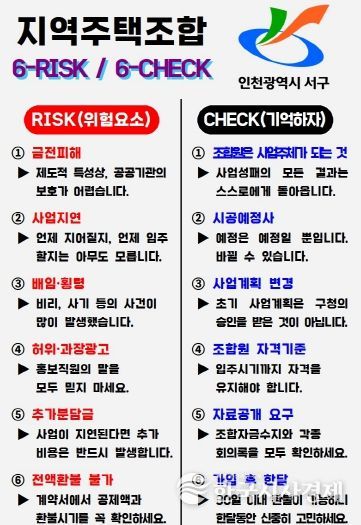 서구는 지역주택조합의 전국적 파산 사례와 사업 정체로 인한 피해가 만연함에 따라 구민의 이해도를 높이고 보다 신중하게 사업에 참여할 수 있도록 지원하고자 조합의 위험 요소와 가입 전 확인해야 할 주요 사항을 담은 ‘지역주택조합 6-RISK / 6-CHECK’를 소식지와 안내문 등을 통해 지속적으로 배포할 계획이다.