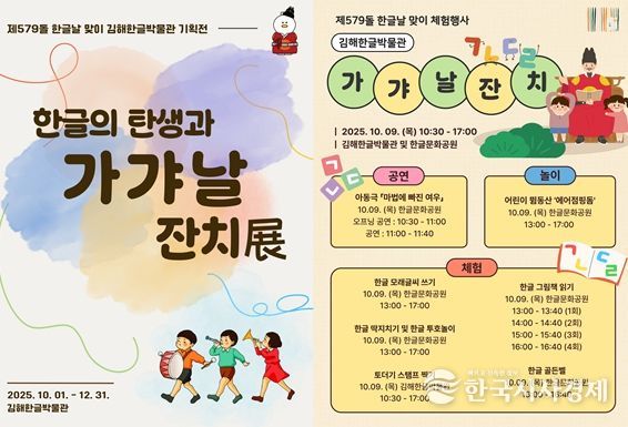 한국시사경제 윤경수 기자 | 김해시는 김해한글박물관이 제579돌 한글날을 맞아 ‘한글의 탄생과 가갸날 잔치’를 주제로 기획전시와 문화행사를 개최한다고 29일 밝혔다.