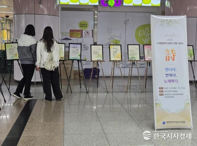 한국시사경제 대전취재본부 | 대전서부교육지원청은 9월 29일부터 10월 17일까지 대전시청역 대합실(대전 서구 둔산중로 55)에서 2025학년도 사제동행 독서문학기행 참가자 28명의 시화 작품 전시회 '詩-만나다. 반하다. 노래하다.'