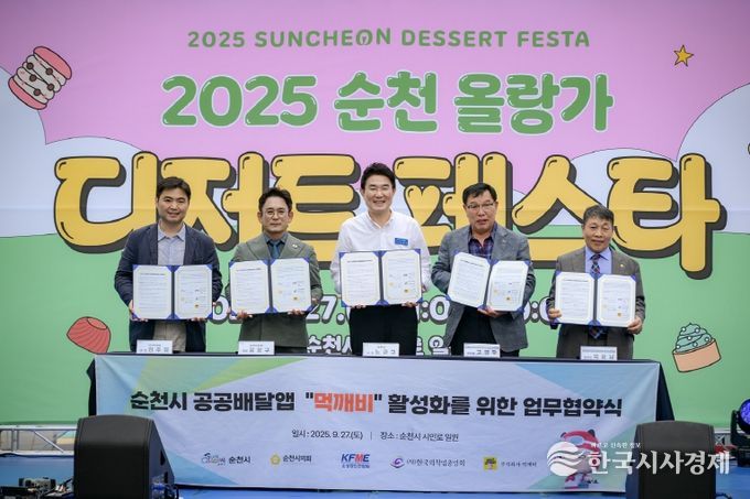 한국시사경제 전남취재본부 | 순천시는 지난 27일 시민로 일원에서 열린 순천 올랑가 디저트 페스타 행사에서 공공배달앱 ‘먹깨비’ 활성화를 위한 업무협약식을 개최했다.