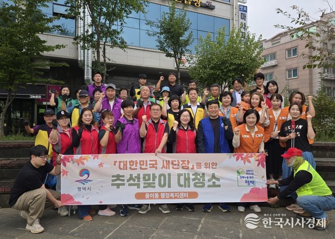 한국시사경제 사회팀 | 평택시 용이동은 지난 25일 평택대 후문 중심상업지구 일대에서 용이동 8개 단체 회원 40여 명이 참석한 가운데 추석맞이 일제 대청소를 진행했다.