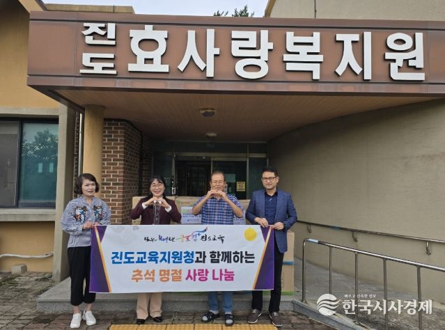 한국시사경제 전남취재본부 | 진도교육지원청은 9월 29일 다가오는 추석 명절을 맞아 지역 내 사회복지시설 2곳(효사랑복지원, 카리타스노인복지센터)을 방문해 정성을 담아 준비한 위문품을 전달하며 따뜻한 이웃사랑을 실천했다.
