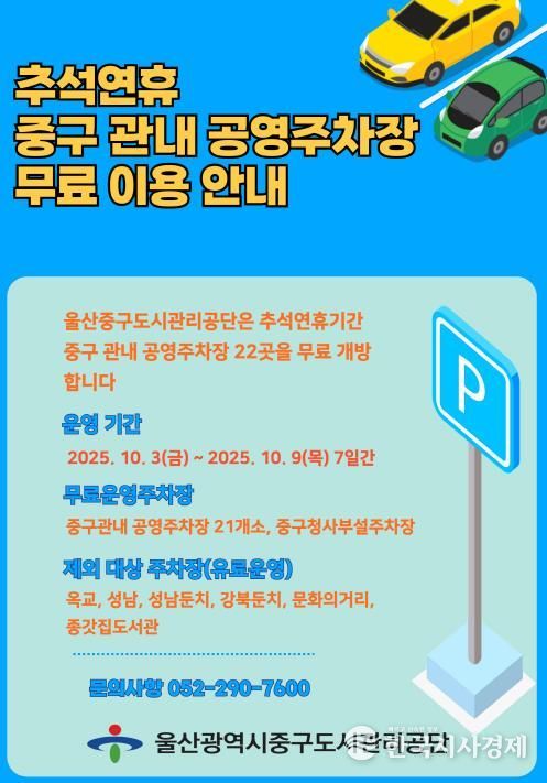 울산중구도시관리공단 관계자는 “귀성객과 주민들의 편의를 증진하고 지역 경제를 활성화하기 위해 이번 추석에도 공영주차장을 무료로 개방한다”며 “주차 질서 유지 및 안전 관리에 최선을 다하겠다”고 밝혔다.