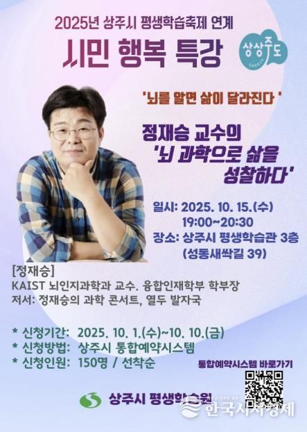 한국시사경제 경북취재본부 | 상주시 평생학습원은 2025. 10. 15. 오후 7시부터 8시30분까지 상주시 평생학습관 3층 강당에서 뇌과학자이자 미래학자인 정재승 KAIST 교수를 초청하여 특별 강연을 진행한다.