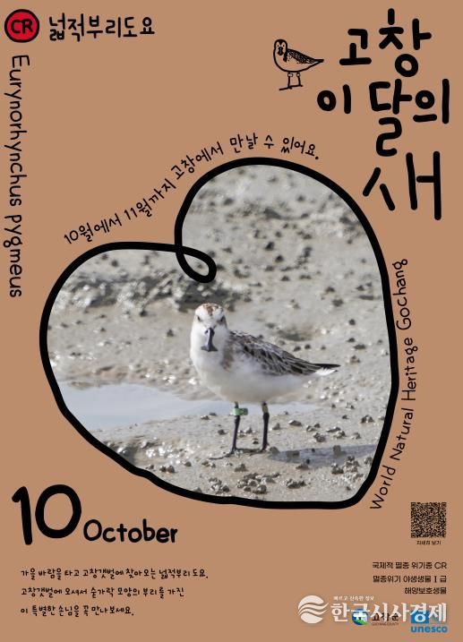 한국시사경제 이정이 기자 | 고창군이 10월 ‘고창갯벌 이달의 새’로 멸종위기 철새인 넓적부리도요(학명 Calidris pygmaea)를 선정하고, 세계적으로 희귀한 철새 보호의 필요성을 알리기 위한 캠페인을 이어간다.