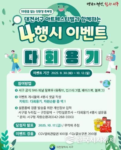 한국시사경제 대전취재본부 | 대전 서구는 오는 10월 10일부터 12일까지 개최되는 ‘2025년 대전 서구 아트페스티벌’을 일회용품 없는 친환경 축제로 운영한다.