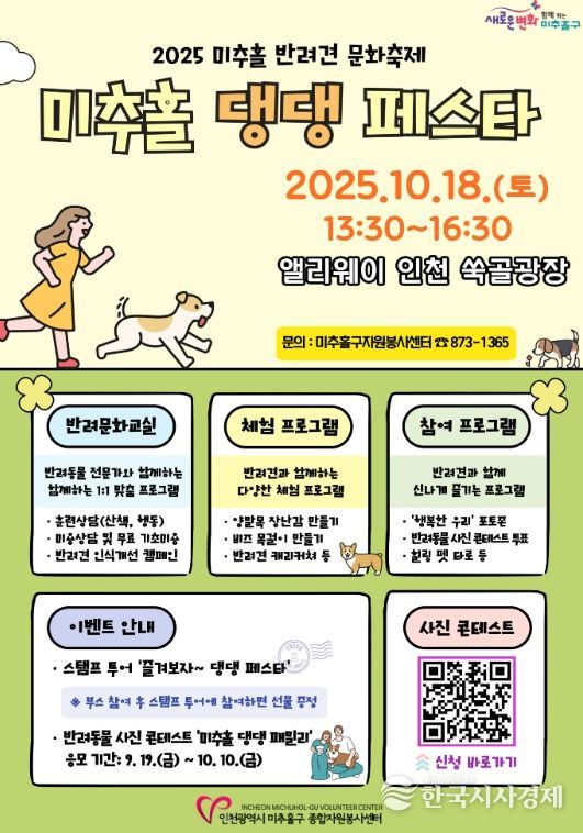 한국시사경제 윤광희 기자 | 인천 미추홀구종합자원봉사센터는 오는 10월 18일 앨리웨이 인천 쑥골광장에서 ‘2025년 미추홀 반려견 문화축제 미추홀 댕댕 페스타’를 개최한다.