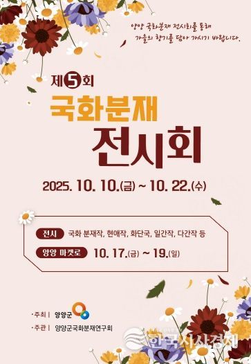 한국시사경제 이정이 기자 | 양양군 국화분재연구회(회장 윤종욱)는 오는 10일부터 22일까지 13일간 양양군농업기술센터에서 ’제5회 국화분재 전시회‘를 개최한다.