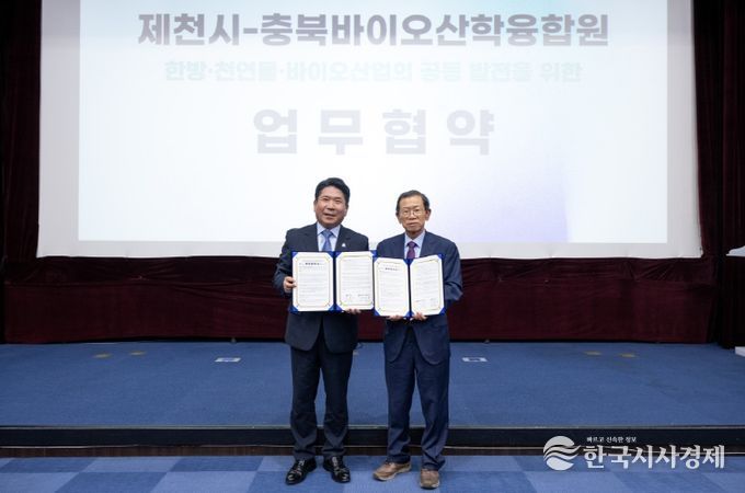 한국시사경제 윤경수 기자 | 제천시는 9월 30일 ‘2025 제천국제한방천연물산업엑스포’ 기간 중 한방생명과학관 다목적강당에서 충북바이오산학융합원과 한방·천연물산업 발전을 위한 업무협약(MOU)을 체결했다.