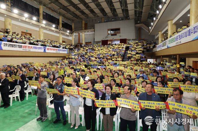 한국시사경제 김숙영 기자 | 무주군이 지난 1일 무주예체문화관 대강당에서 농어촌 기본소득 시범사업 선정을 촉구하는 범군민 결의대회를 개최했다.
