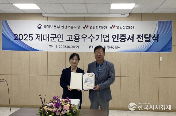 한국시사경제 문화팀 | 국가보훈부 인천보훈지청(지청장 직무대리 최은진) 제대군인지원센터는 2025년 10월 1일에 제대군인 주간을 맞아 영림그룹의 계열사인 영림화학(주)과 영림산업(주)을 방문하여 제대군인 고용 우수기업인증에 대한 현판식을 개최했다.