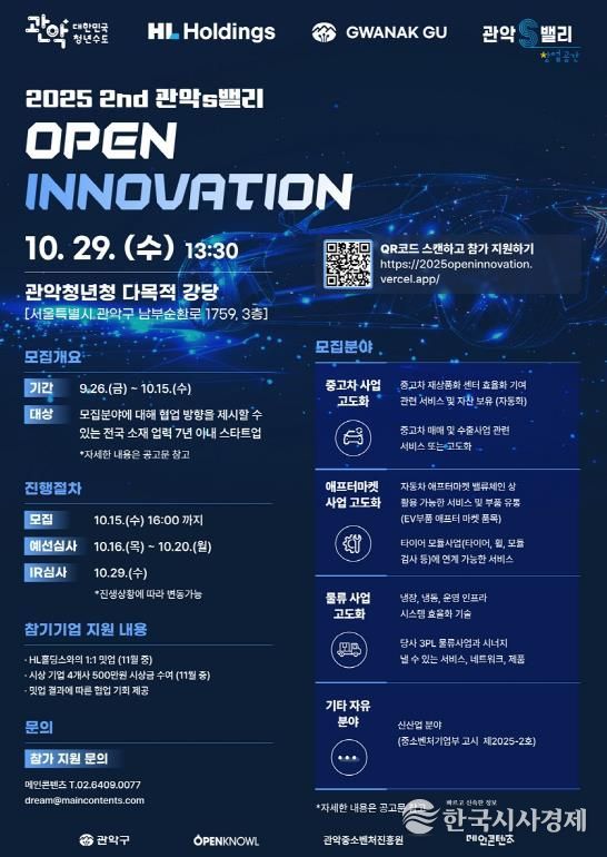 한국시사경제 권충현 기자 | 관악구가 자동차, 물류 분야 글로벌 네트워크를 보유한 ‘HL홀딩스’와 함께 ‘2025 제2회 관악S밸리 오픈 이노베이션’에 참가할 기업을 모집한다.