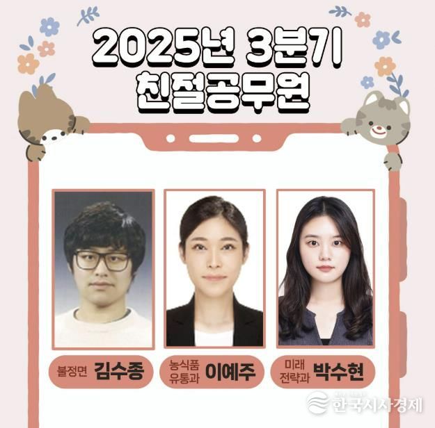 한국시사경제 충북취재본부 | 충북 괴산군은 2025년 3분기 친절공무원으로 김수종 주무관(불정면사무소), 이예주 주무관(농식품유통과), 박수현 주무관(미래전략과)을 선정했다고 밝혔다.