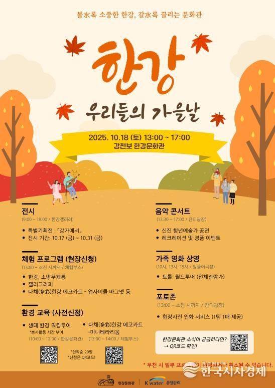 한국시사경제 기동취재팀 | K-water한강보관리단과 케이워터운영관리 한강문화관은 오는 10월 18일 가족과 이웃이 함께 즐기는 대표 문화축제 “한강, 우리들의 가을날”를 개최한다고 밝혔다