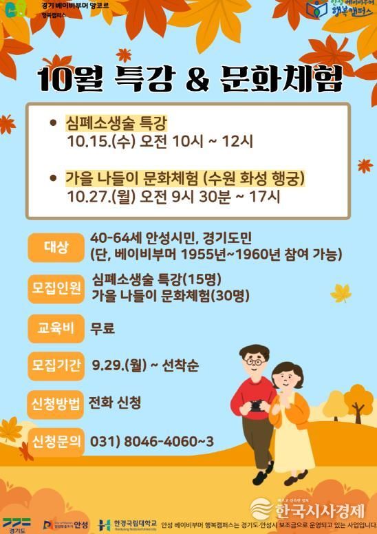 한국시사경제 경기취재본부 | 안성 베이비부머 행복캠퍼스(한경국립대학교 평생교육원)는 오는 10월 15일부터 27일까지 중장년 안성시민(경기도민)을 대상으로 ‘10월 특강(심폐소생술) 및 문화체험(수원화성행궁)’ 프로그램을 운영한다고 밝혔다.