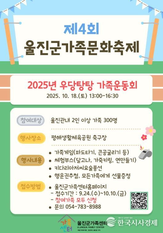 한국시사경제 권충언 기자 | 울진군은 울진군가족센터가 오는 10월 18일 오후 1시부터 평해생활체육공원 축구장에서 제4회 울진군가족문화축제‘우당탕탕 가족운동회’를 개최한다.