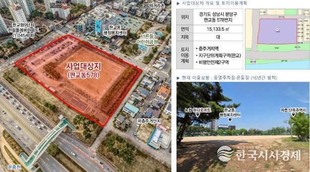 신상진 성남시장은 “오랫동안 미개발 상태로 남아있던 판교동 578번지에 대기업과 복합문화체육시설이 조성되면 일대 유동인구 증가로 교통 인프라 개선 촉진 및 서판교 일대 추가역 신설에 대한 수요 타당성에도 긍정적으로 작용할 것으로 기대한다”며 “올해 하반기부터 지구단위계획 변경 등 행정 절차를 신속히 추진해 2030년 완료를 목표로 속도감 있게 사업을 추진하겠다”고 밝혔다.